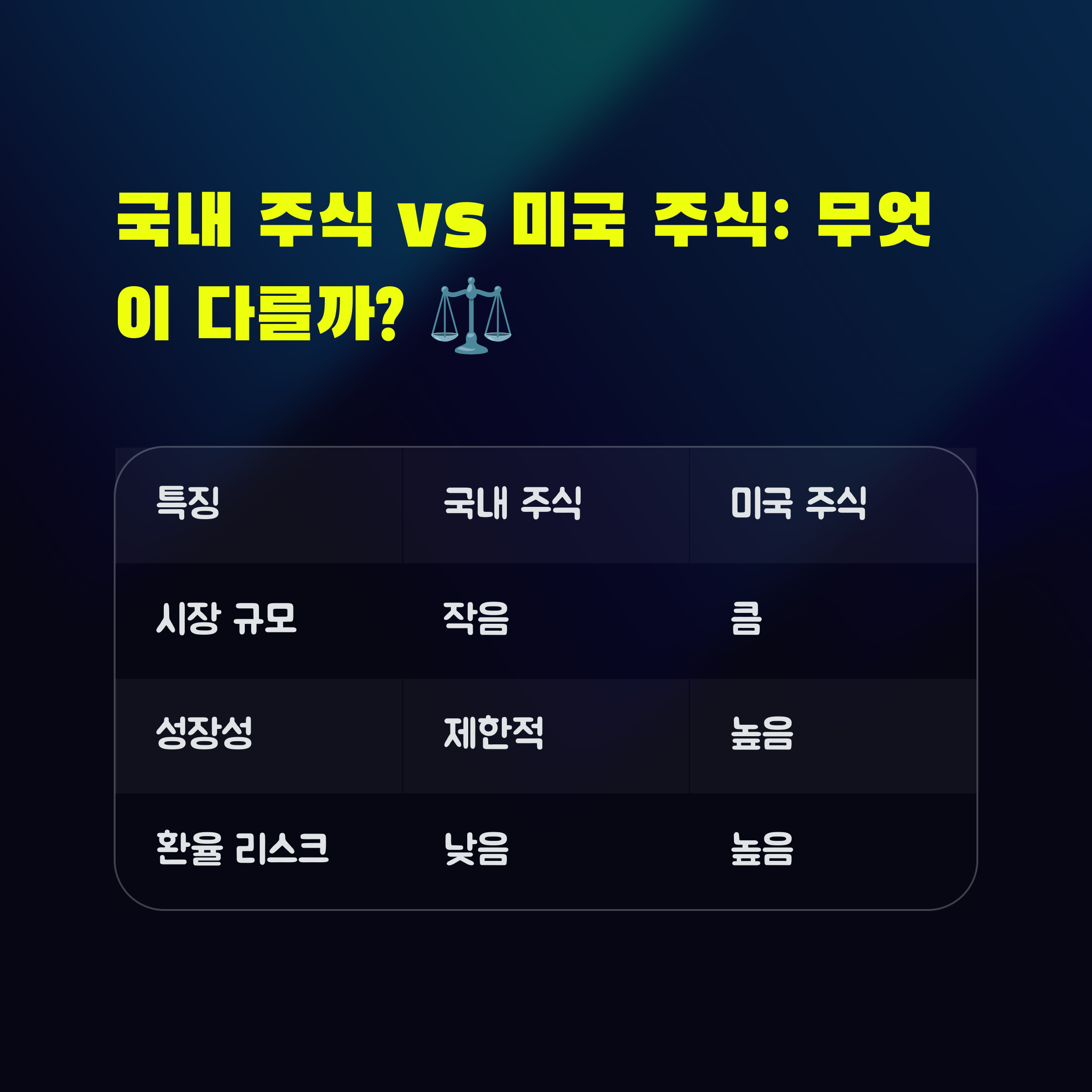 미국 주식 시장은 전 세계에서 가장 크고 활발한 시장입니다. 애플, 구글, 테슬라 같은 글로벌 기업에 직접 투자할 수 있으며, 다양한 ETF와 고배당주 선택지도 존재합니다. 또한 장기적으로 안정적인 수익을 추구하는 데 유리한 조건이 많습니다. 반면, 국내 주식은 정보 접근성과 환율 리스크는 적지만 성장성 측면에서는 상대적으로 한계가 있습니다.